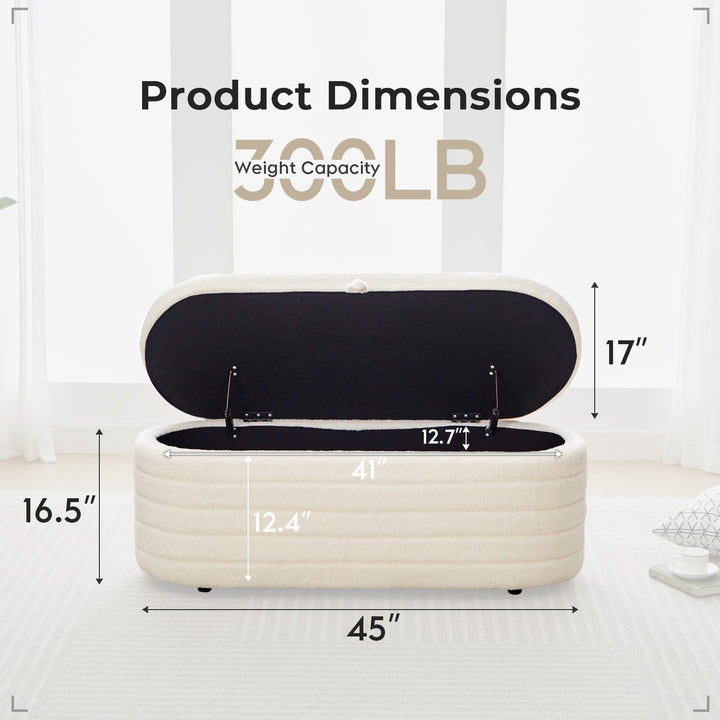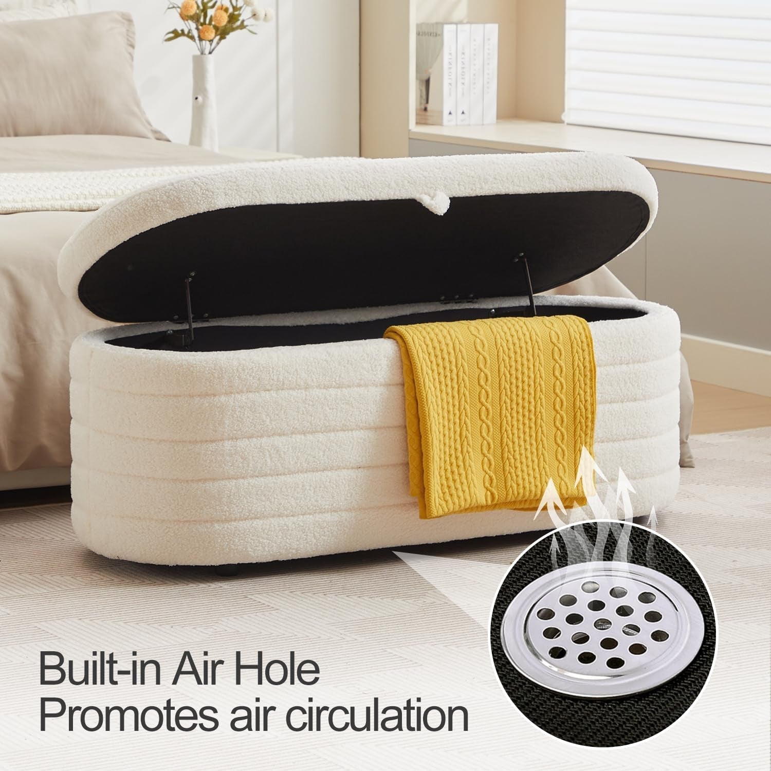 Transform clutter into calm with a 45-inch storage ottoman bench wrapped in soft boucle fabric. A safety-fast lid, ample hidden storage, and versatile design come together to keep your space neat, comfortable, and ready for everyday moments.