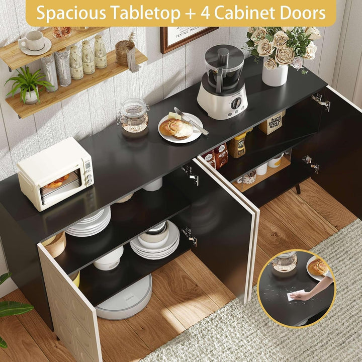 Its exterior features refined fluted panels and hand-carved wave patterns in a sophisticated black and oak finish, making this buffet cabinet more than storage—it's a design centerpiece.