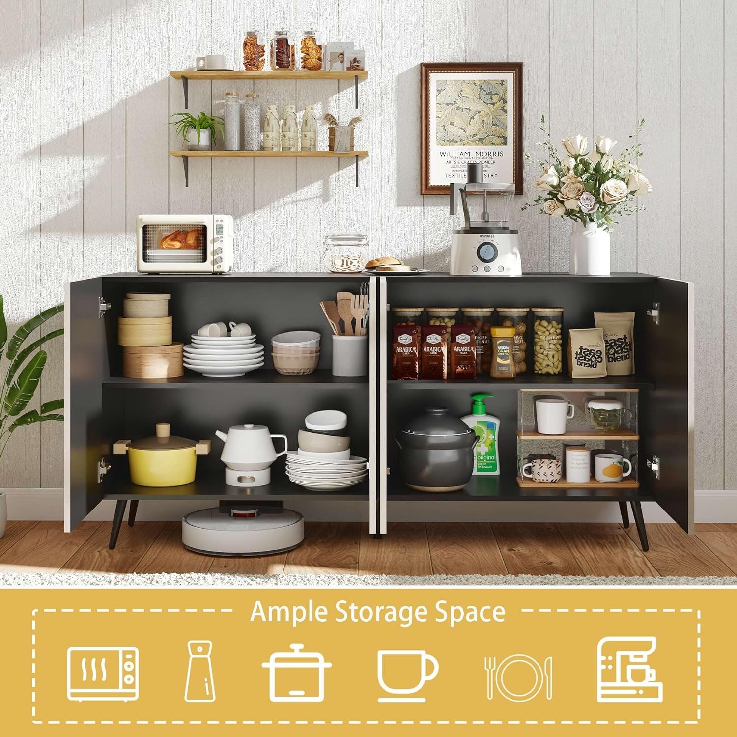 63-inch oak and black mid-century modern sideboard that blends showroom-worthy design with everyday organization. This piece does more than store—it's a statement that elevates dining rooms, living spaces, and garages alike.