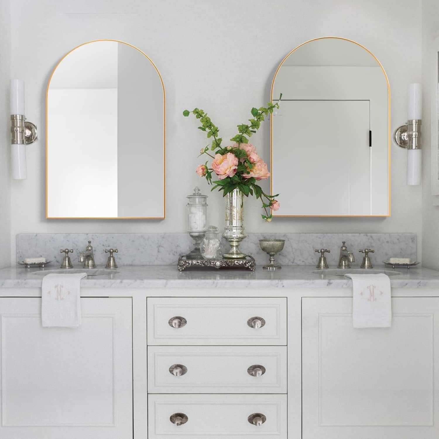 Elevate your space with an arched wall-mounted vanity mirror in a radiant gold finish. Measuring 20x30 inches, this two-piece design adds a soft, decorative glow to bathrooms, entryways, or salons while delivering sturdy, wobble-free mounting.