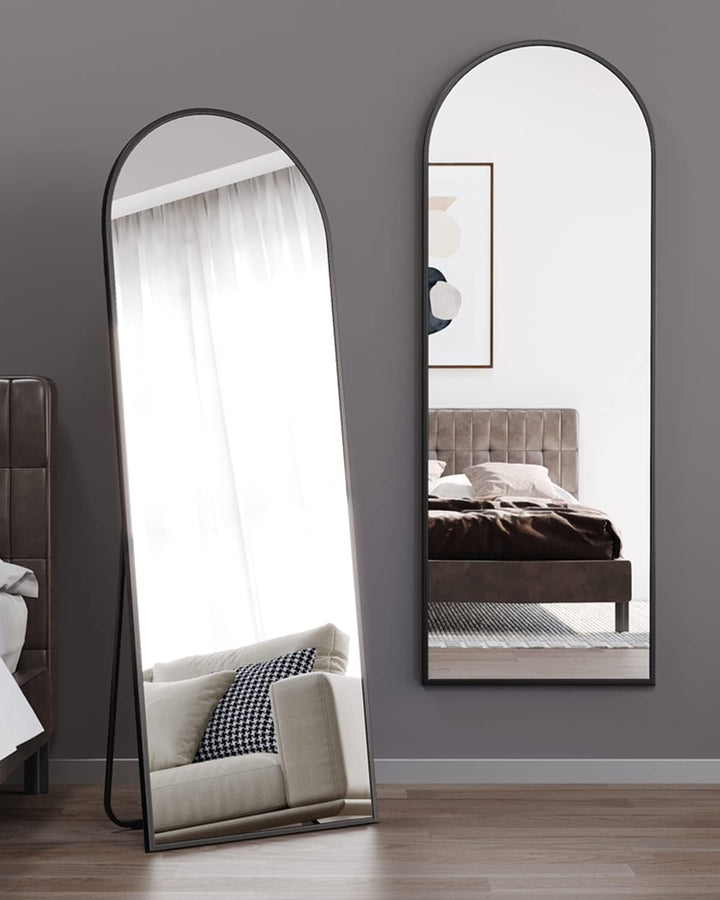 See your full silhouette with purpose and elevate any room in an instant. This black floor mirror is a stylish, functional centerpiece for bedrooms and living spaces, offering a complete view while enhancing your décor.
