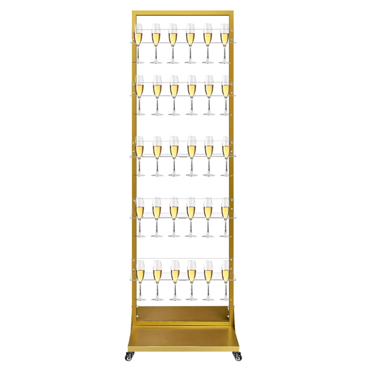 ["【Eye-catching Holder】Our champagne holder isnt just a functional piece; its a statement of refinement and luxury which can display champagne cups elegantly. The ability to move the rack adds a dynamic element allowing it can effortlessly adapt to changing party dynamics and keep the champagne flowing seamlessly. Each set comes equipped with both caster wheels and stationary feet providing flexibility according to your preferences." 【Versatile Design】Dimensions please see picture 3. This innovative design optimizes space utilization effortlessly accommodating up to 20-30 champagne glasses without crowding the serving area. And the detachable tiers can flexibly customize the layout which meet the needs of different length cups whether they are traditional flutes or trendy coupe glasses our champagne holder all fits. 【Premium Craftsmanship】Crafted with durability in mind the sturdy steel frame combined with exquisite acrylic champagne glasses holders ensure longevity and reliability capable of withstanding the rigors of regular use without losing their luster. Enjoy a 360-degree showcase of your finest champagne with confidence. 【Effortless Setup and Storage】Our champagne holder is designed for easy assembly and disassembly saving you valuable storage space when it is not in use. With a detailed installation manual and all accessories included you’ll be able to assemble it in 5 minutes. 【Great Customer Service】Our Customer Service Team Is Ready To Reply Your Messages Within 24 Hours]