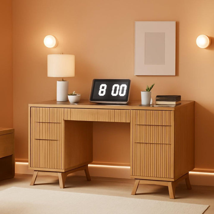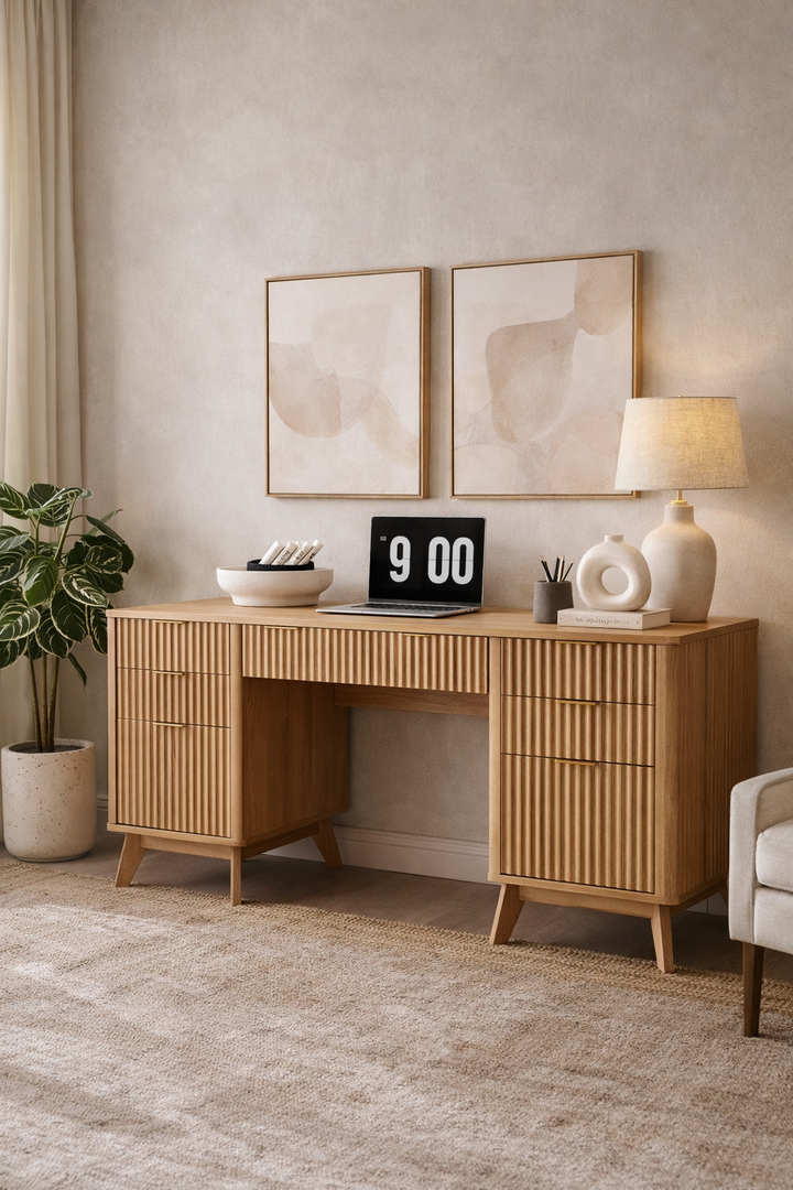 Crafted from sustainable materials, including FSC-certified wood, durable MDF, and P2 engineered wood, the desk is built to last. A strong desktop supports up to 150 lbs, while distinctive fluted panels, a sleek curved profile, and sturdy legs ensure it complements a wide range of decor styles.
